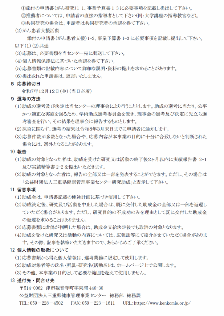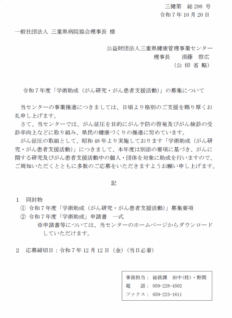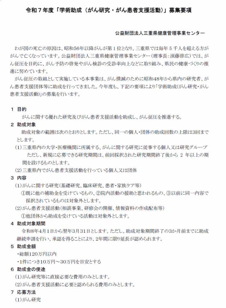 令和7年度「学術助成(がん研究・がん患者支援活動)」の募集について