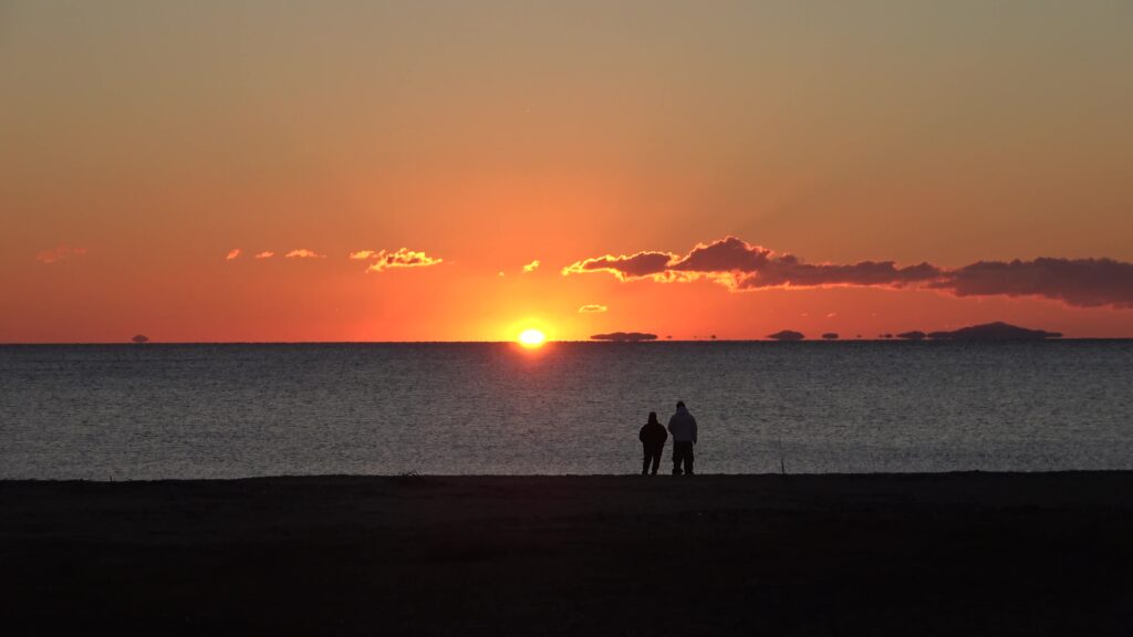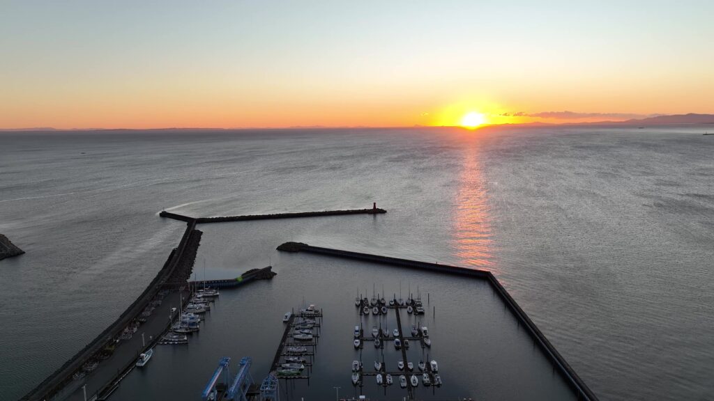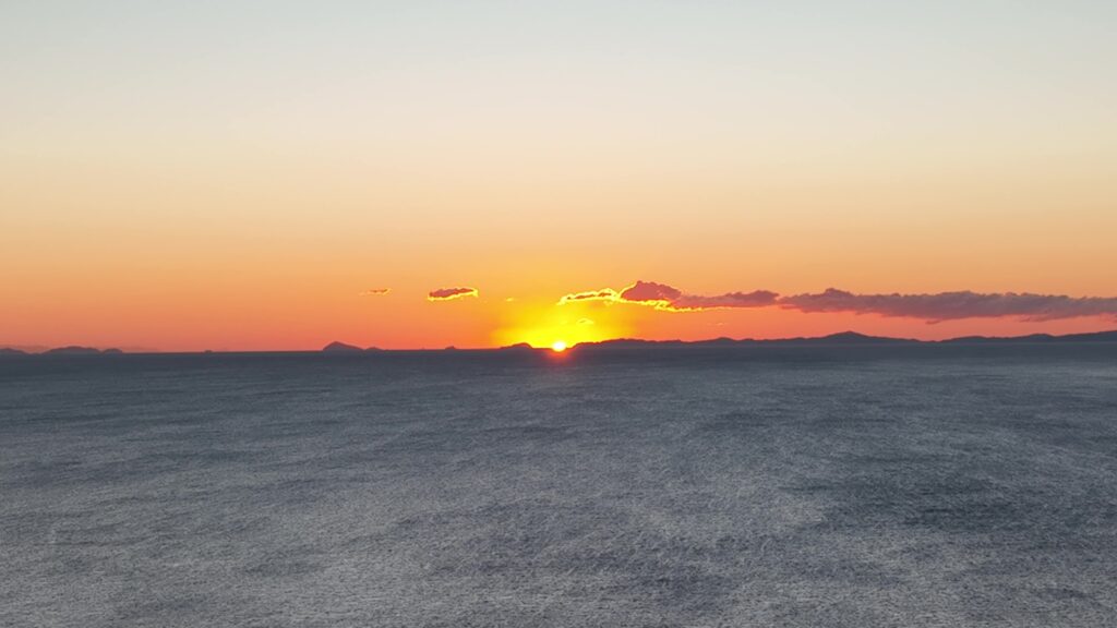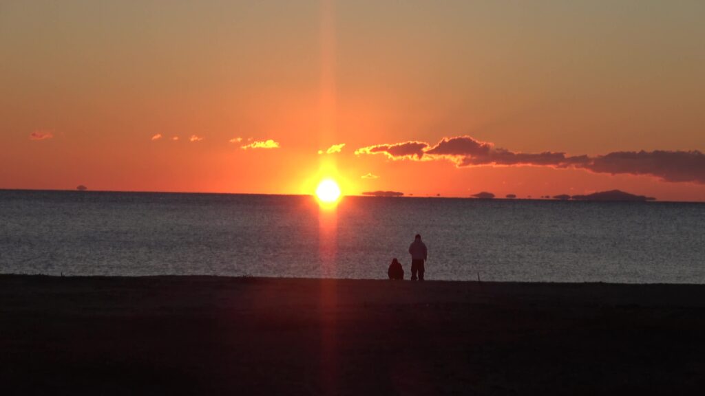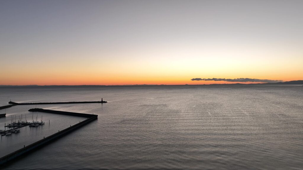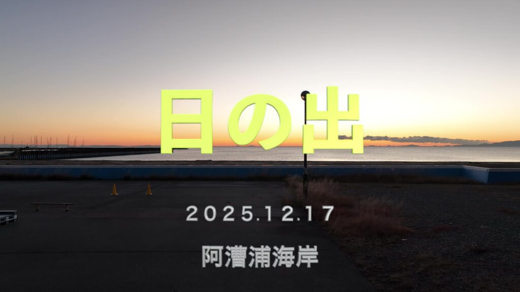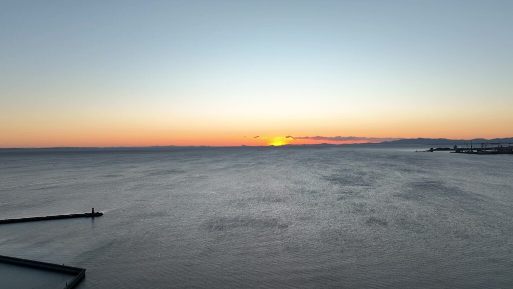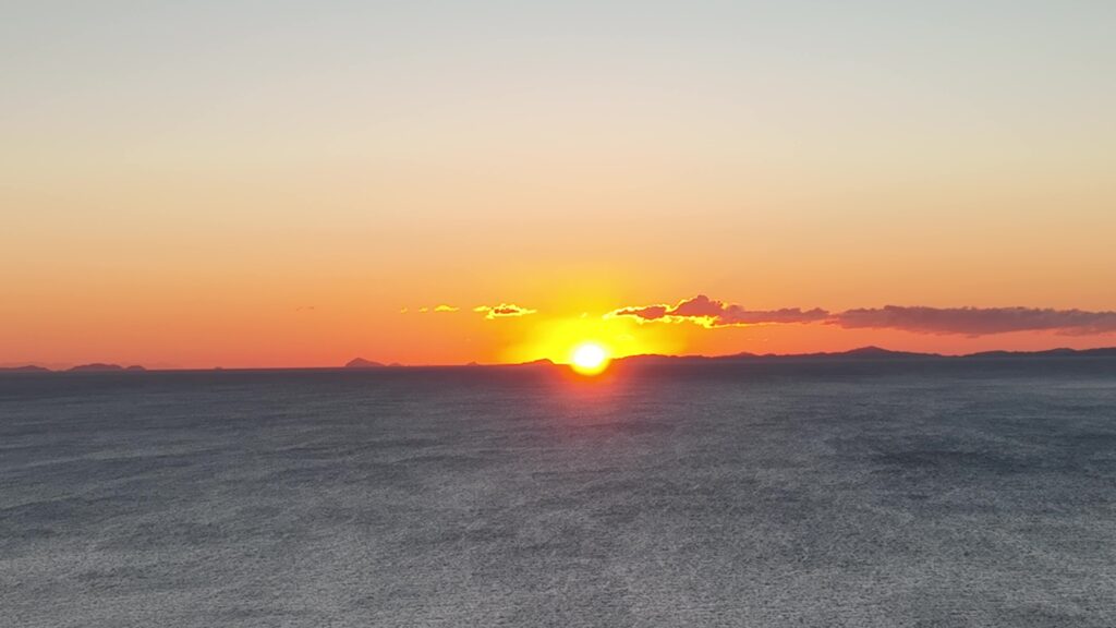2025.12.17  師走半ばの早朝に、風もなく、海は凪いでおり、水平線には少しの雲がかかっている阿漕浦海岸から日の出を空撮してきました。