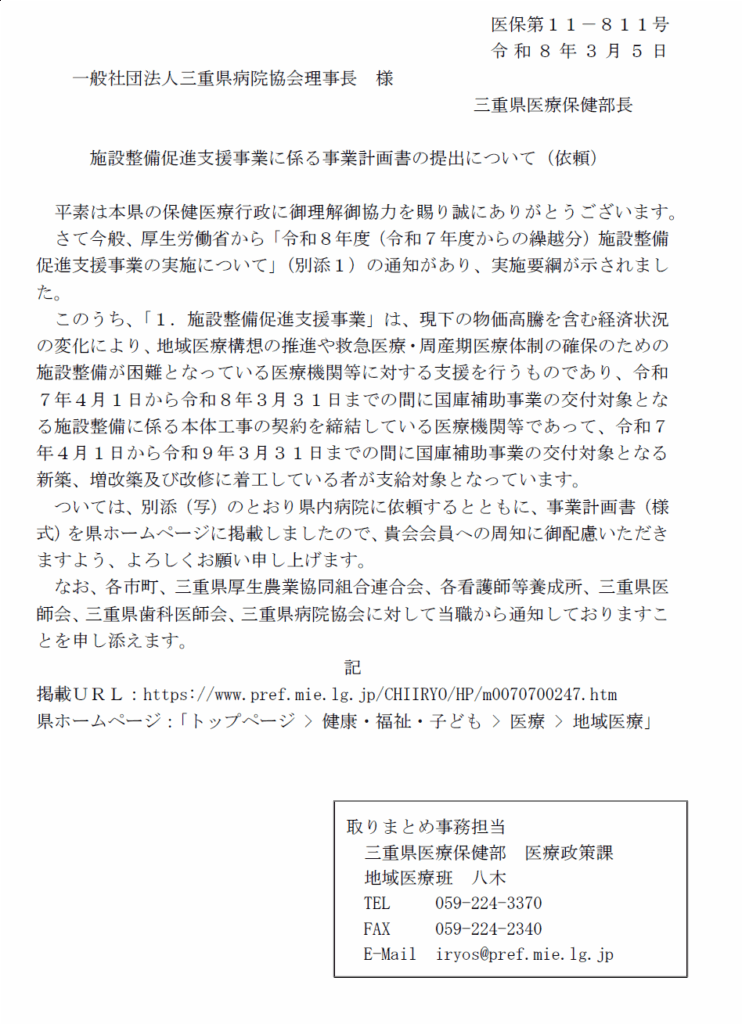 お知らせ/三重県からの情報/新着情報 施設整備促進支援事業に係る事業計画書の提出について 2026年3月6日 by mieha 三重県:https://www.pref.mie.lg.jp/CHIIRYO/HP/m0070700247.htm